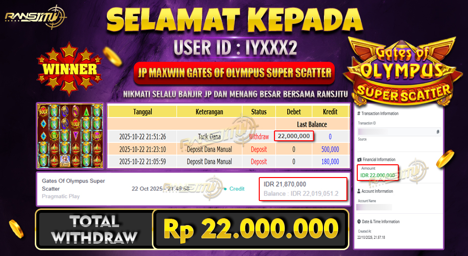 Hadiah telah di WD (Withdraw) oleh player yang bersangkutan Terima kasih untuk member setia kami telah mempercayakan RANSJITU sebagai BO pilihan anda