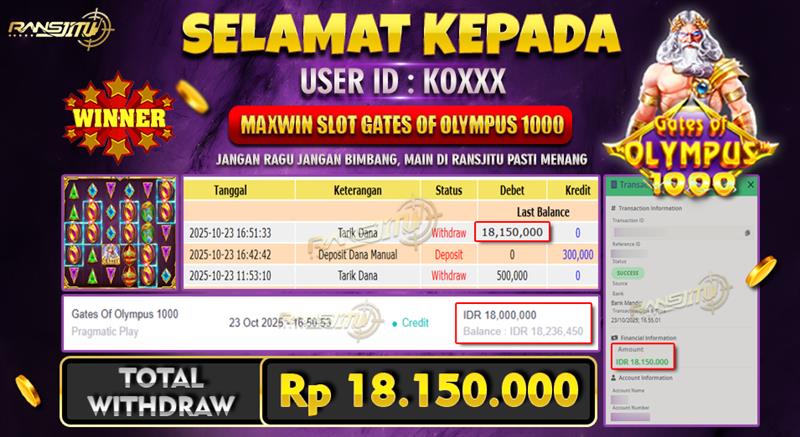 Hadiah telah di WD (Withdraw) oleh player yang bersangkutan Terima kasih untuk member setia kami telah mempercayakan RANSJITU sebagai BO pilihan anda
