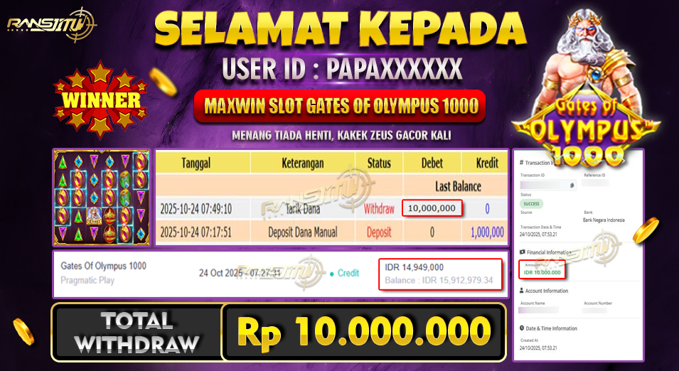 Hadiah telah di WD (Withdraw) oleh player yang bersangkutan Terima kasih untuk member setia kami telah mempercayakan RANSJITU sebagai BO pilihan anda