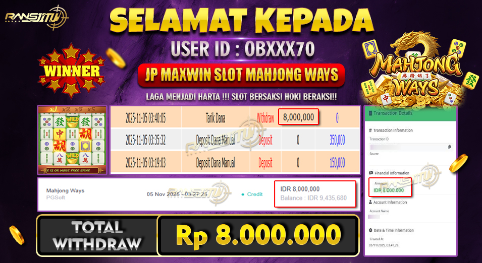 Hadiah telah di WD (Withdraw) oleh player yang bersangkutan Terima kasih untuk member setia kami telah mempercayakan RANSJITU sebagai BO pilihan anda