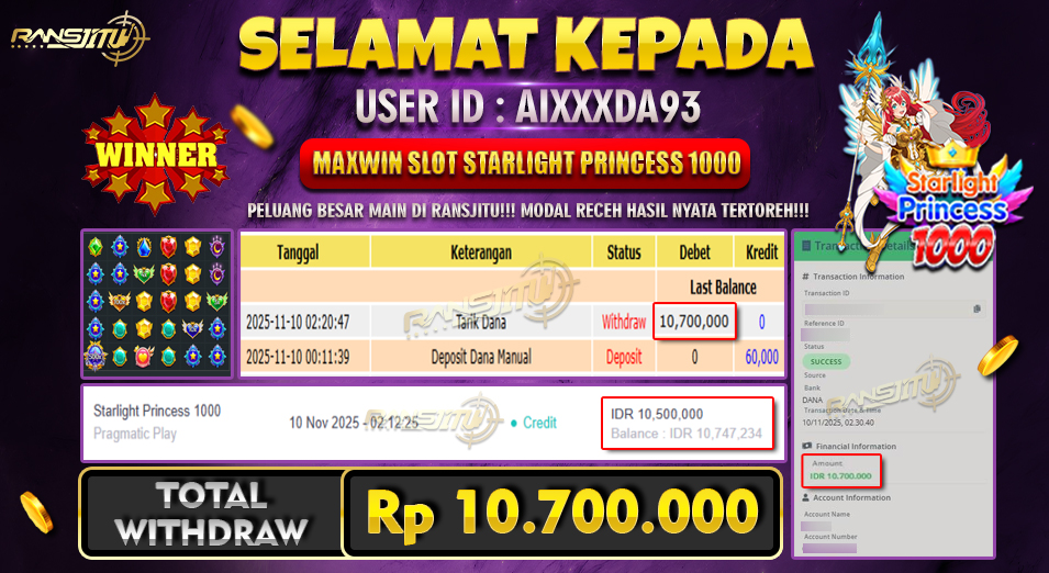 Hadiah telah di WD (Withdraw) oleh player yang bersangkutan Terima kasih untuk member setia kami telah mempercayakan RANSJITU sebagai BO pilihan anda