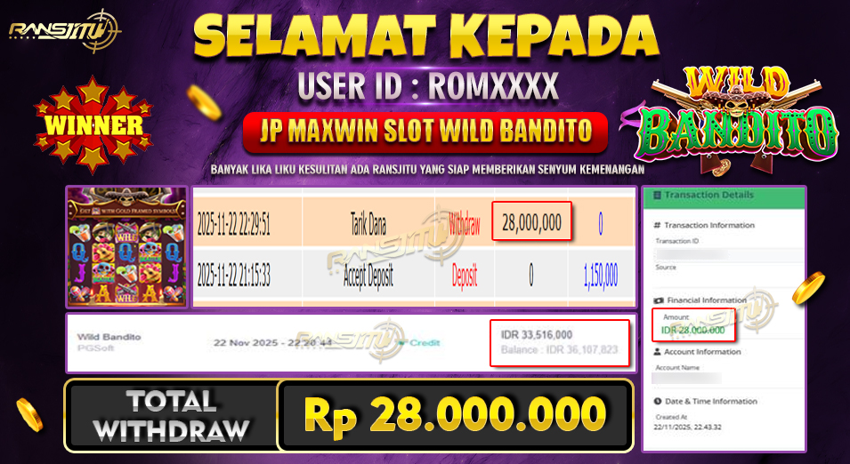 Hadiah telah di WD (Withdraw) oleh player yang bersangkutan Terima kasih untuk member setia kami telah mempercayakan RANSJITU sebagai BO pilihan anda