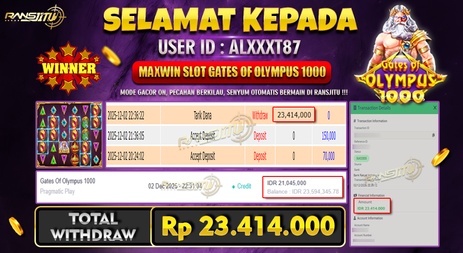 Hadiah telah di WD (Withdraw) oleh player yang bersangkutan Terima kasih untuk member setia kami telah mempercayakan RANSJITU sebagai BO pilihan anda