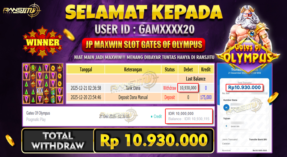 Hadiah telah di WD (Withdraw) oleh player yang bersangkutan Terima kasih untuk member setia kami telah mempercayakan RANSJITU sebagai BO pilihan anda