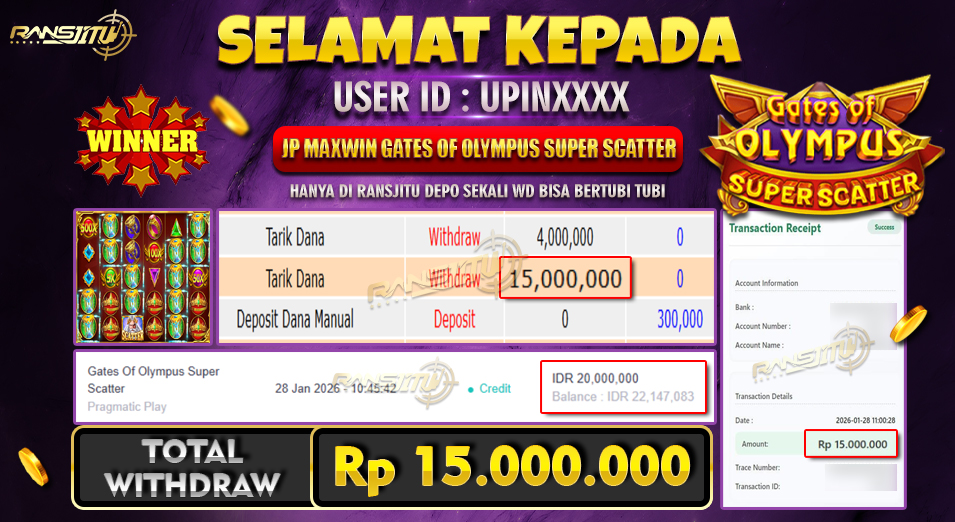Hadiah telah di WD (Withdraw) oleh player yang bersangkutan Terima kasih untuk member setia kami telah mempercayakan RANSJITU sebagai BO pilihan anda Post navigation BUKAN SEKEDAR SPIN, INI MOMEN 15.000X MANIA BERBICARA, RITME TEPAT HASIL MELEDAK BUY FREE SPIN AUTO MEGA WIN