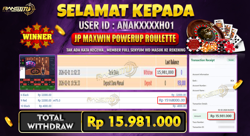 Hadiah telah di WD (Withdraw) oleh player yang bersangkutan Terima kasih untuk member setia kami telah mempercayakan RANSJITU sebagai BO pilihan anda