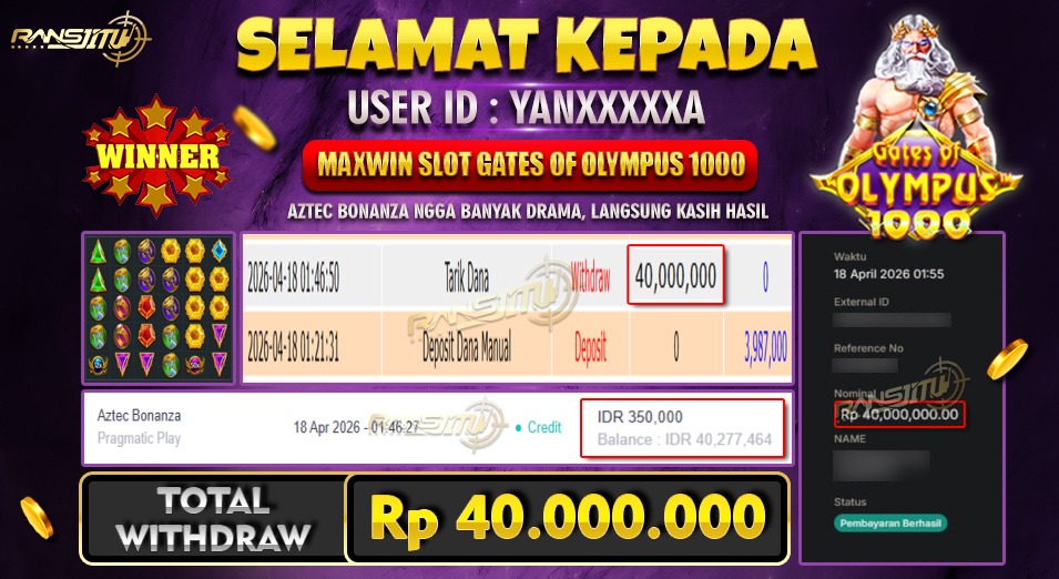 Hadiah telah di WD (Withdraw) oleh player yang bersangkutan Terima kasih untuk member setia kami telah mempercayakan RANSJITU sebagai BO pilihan anda
